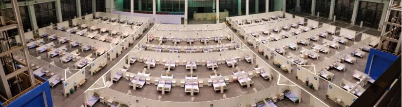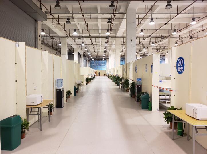 15日完成上下兩層病患區(qū)共1047個床位隔斷、給排水、供電、通信、監(jiān)控、化糞池等主體功能,16日物資采購基本到位,“方艙”生活用品、衛(wèi)生間、洗漱、淋浴、空調取暖、熱水器、醫(yī)廢收集等功能配套安裝布設到位。緊接著,邀請中央、省、市三級疾控專家現(xiàn)場指導,“三區(qū)兩通道”、新風系統(tǒng)等逐步完善。建設者們克服一切困難,一周時間內建成這座方艙醫(yī)院。市指揮部原下達1000張床位任務,為盡力發(fā)揮功效,最終擴為1047個。